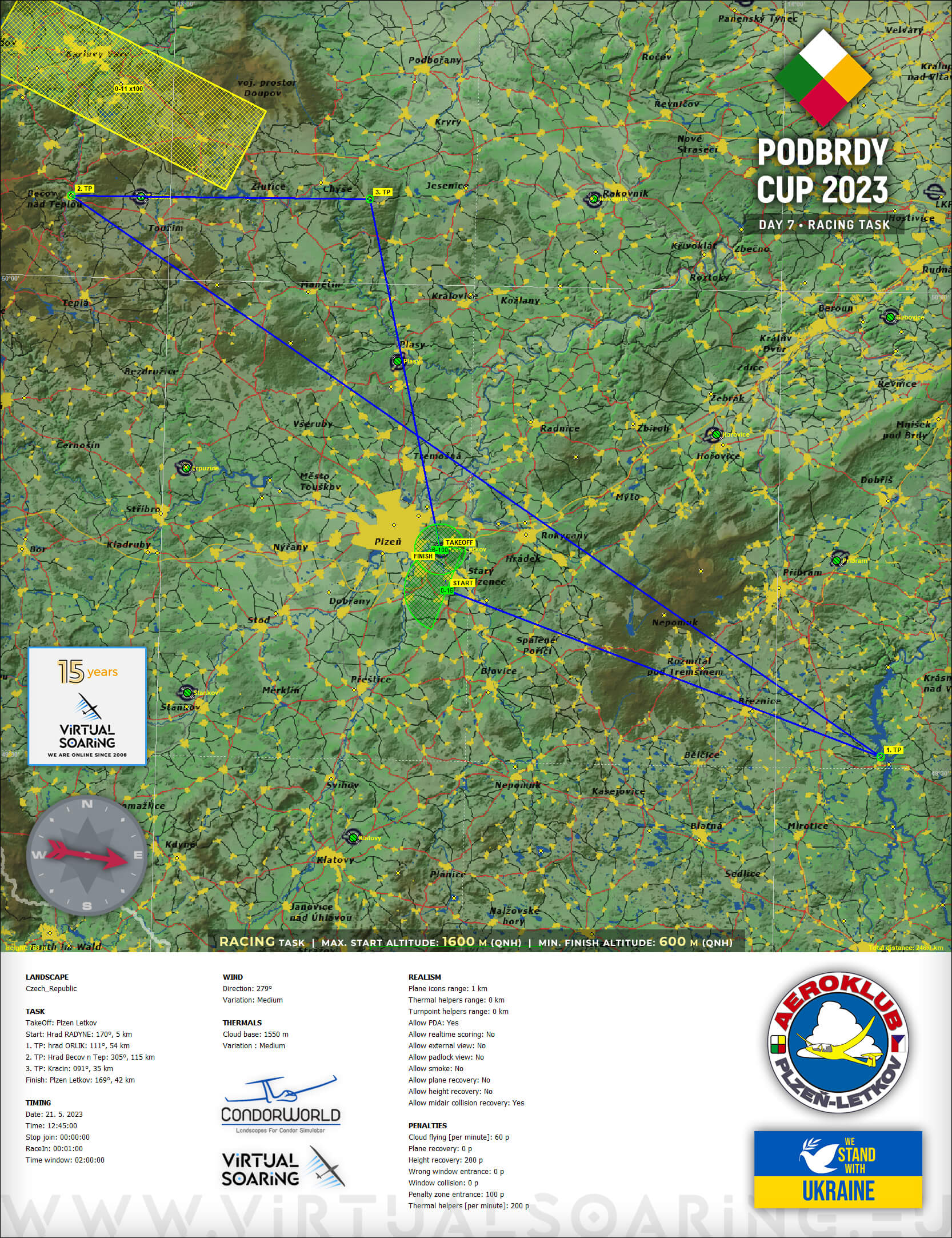 Létání v mracích je zakázáno! Směr kroužení ve stoupání určuje první kluzák ve stoupání. Pokud bude mít soutěžící pochyby o směru, dotáže se na chatu nebo Teamspeaku. Upozornění: jsou-li aktivní zakázané prostory - sledujte PDA po celou dobu letu! Lítejte BEZPEČNE a pro radost, hodně štěstí všem!