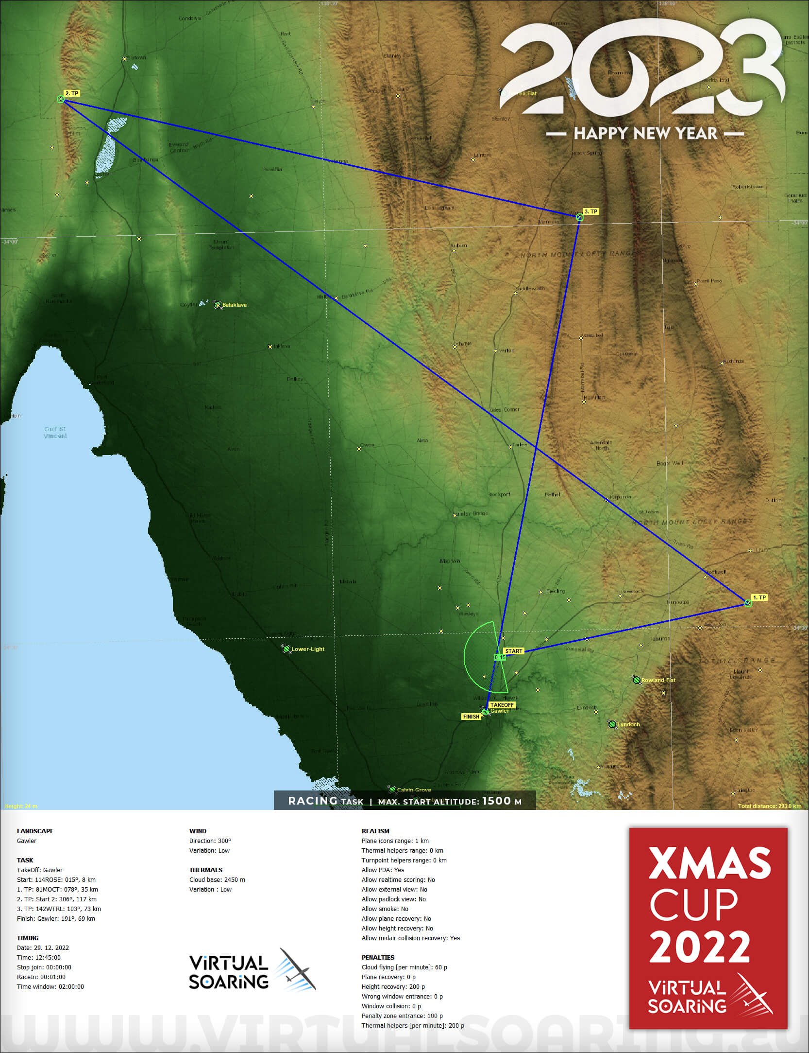 Létání v mracích je zakázáno! Směr kroužení ve stoupání určuje první kluzák ve stoupání. Pokud bude mít soutěžící pochyby o směru, dotáže se na chatu nebo Teamspeaku. Upozornění: jsou-li aktivní zakázané prostory - sledujte PDA po celou dobu letu! Lítejte BEZPEČNE a pro radost, hodně štěstí všem pilotům!